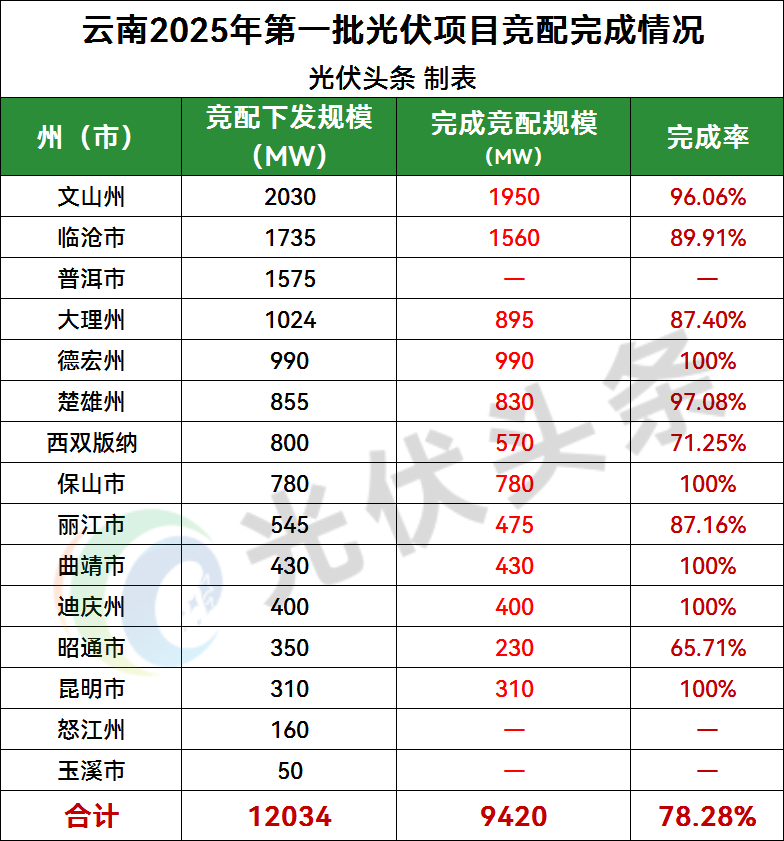 從競配完成率情況來看,截止目前,2025年第一批次共有105個(gè),規(guī)模共計(jì)9420MW光伏項(xiàng)目完成競配,完成總規(guī)模的78.28%。其中,德宏州、保山市、曲靖市、迪慶州、昆明市競配完成率達(dá)100%,各地完成規(guī)模如下表所示。