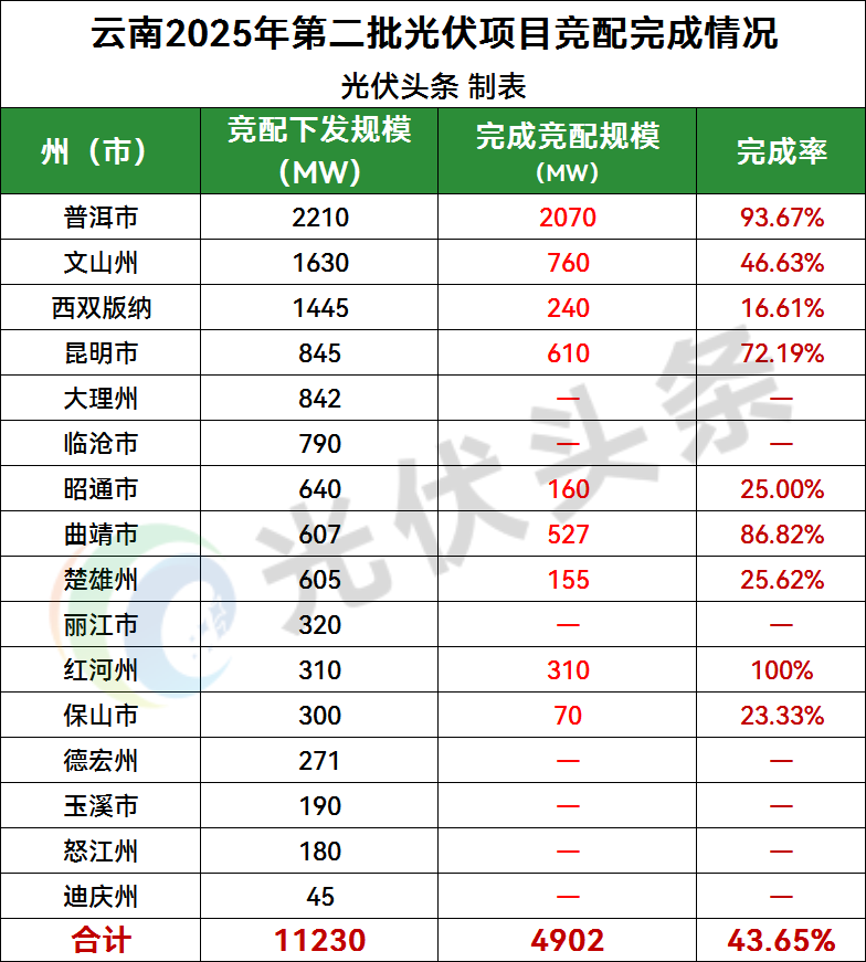 從競配完成率情況來看,截止目前,2025年第二批次共有73個(gè),規(guī)模共計(jì)4902MW光伏項(xiàng)目完成競配,完成總規(guī)模的43.65%。其中,紅河州競配完成率達(dá)100%,普洱市競配完成率93.67%,各地完成規(guī)模如下表所示。