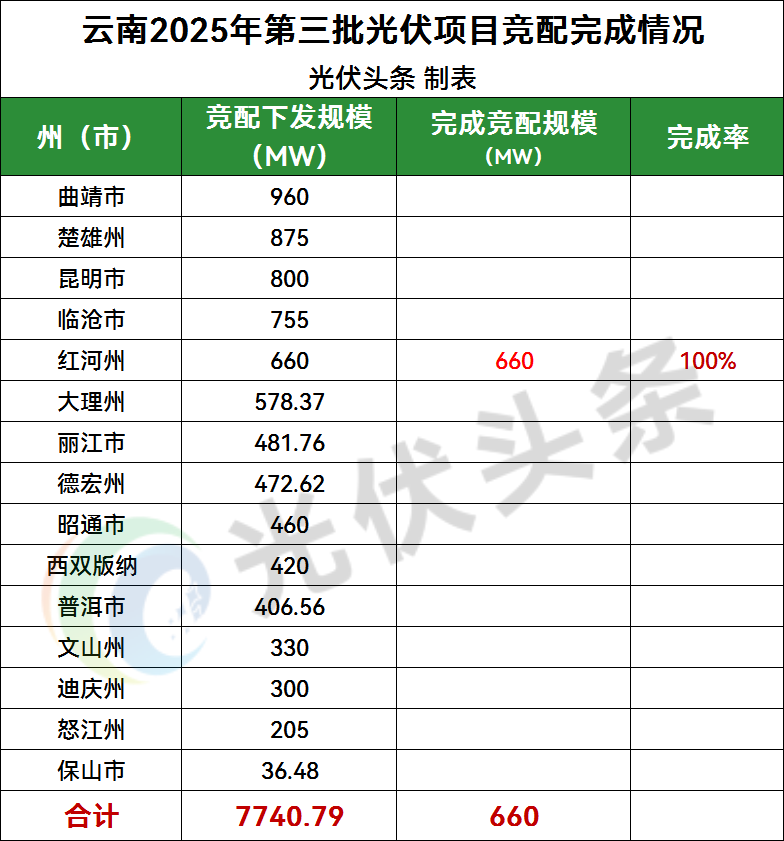 從競配完成率情況來看,截止目前,2025年第三批次只有紅河州12個(gè)光伏項(xiàng)目,規(guī)模共計(jì)660MW完成競配,其余州(市)暫無相關(guān)競配進(jìn)展。