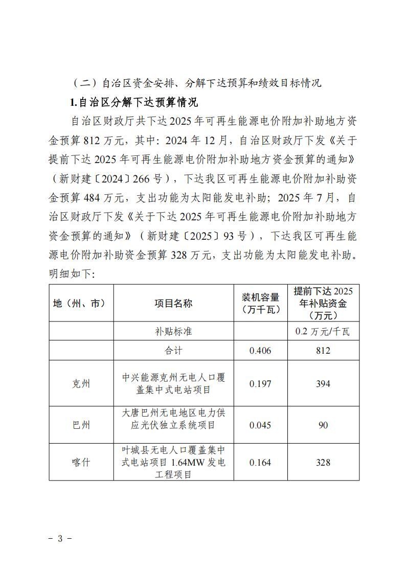 2025年5月《財(cái)政部關(guān)于下達(dá)2025 年可再生能源電價(jià)附加補(bǔ)助地方資金預(yù)算的通知》(財(cái)建〔2025〕133 號(hào))下達(dá)新疆維吾爾自治區(qū)2025年可再生能源電價(jià)附加補(bǔ)助資金328萬(wàn)元。