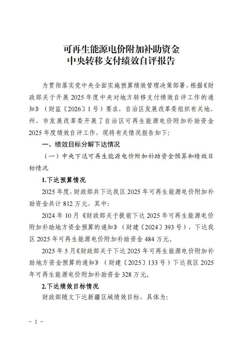 為貫徹落實(shí)黨中央全面實(shí)施預(yù)算績(jī)效管理決策部署,根據(jù)《財(cái)政部關(guān)于開(kāi)展2025年度中央對(duì)地方轉(zhuǎn)移支付績(jī)效自評(píng)工作的通知》(財(cái)監(jiān)〔2026〕1號(hào))要求,我委會(huì)同自治區(qū)財(cái)政廳組織有關(guān)地(州、市)發(fā)展改革和財(cái)政部門(mén),開(kāi)展了可再生能源電價(jià)附加補(bǔ)助資金中央轉(zhuǎn)移支付2025年度績(jī)效自評(píng)報(bào)告,現(xiàn)將自評(píng)情況予以公告。