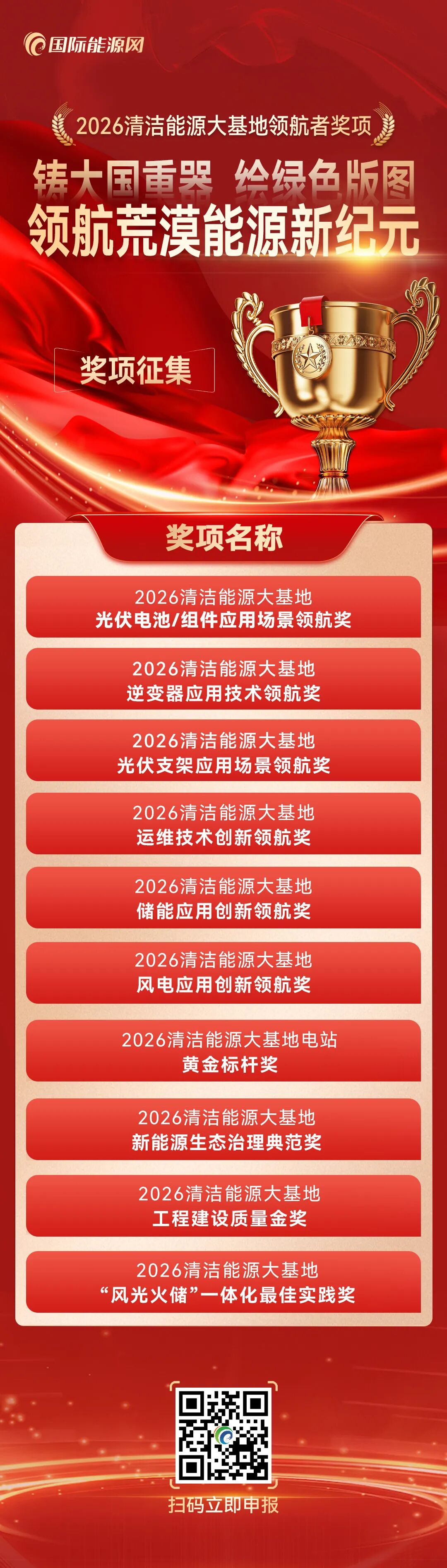 2026年度清潔能源大基地系列獎項全年均可申報,誠邀行業(yè)內(nèi)優(yōu)秀企業(yè)踴躍參與,攜手共繪人類能源發(fā)展的綠色傳奇!